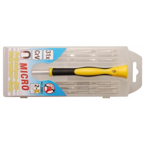 Króm-vanádium acélból készül 4 mm-es hatlap hajtás Ideális precíziós, műszerész munkákhoz Felakasztható műanyag tartóban A készlet tartalma: Lapos fejű bitek: SL 1.5 - 2 - 2.5 - 3 - 3.5 - 4 mm Kereszthornyú bitek: PH00 - PH0 - PH1 - PH2 Torx bitek: T4