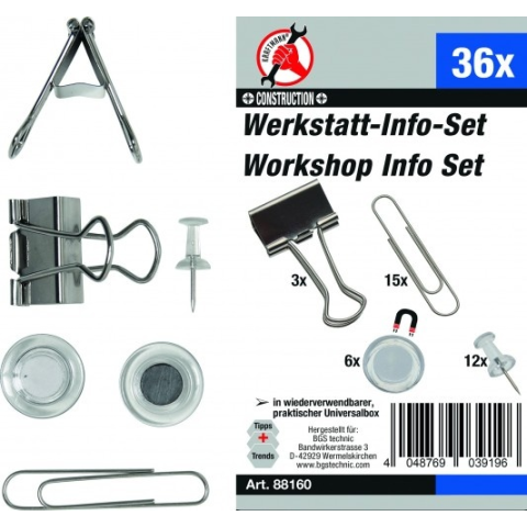 Praktikus, újra felhasználható dobozban.A készlet tartalma:15 db gémkapocs6 db mágnes3 db binder kapocs12 db térképtű