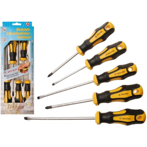 Króm-vanádium acélból készül;Mágneses csavarhúzó fejek;Csúszásmentes markolat;Megfelel a DIN 5264 szabványnak.A készlet tartalma:3 db lapos csavarhúzó: 4,0x80 mm, 5,5x125 mm, 6,5x150 mm2 db kereszthornyos csavarhúzó: PH1x80 mm, PH2x100 mm