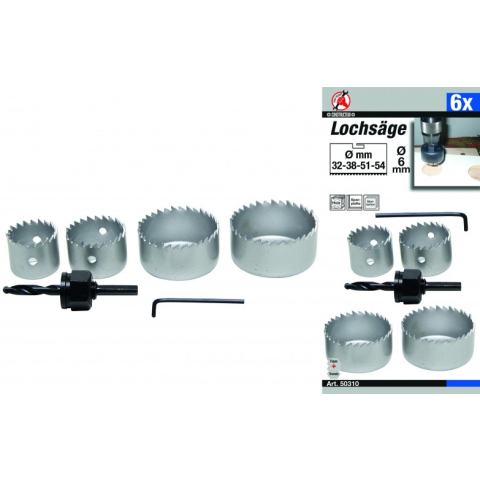 Fában gipszkartonban és forgácslapban használható;Max. 24 mm-es vágási mélység.A készlet tartalma:4 db lyukfűrész, átmérők: 32, 38, 51, 54 mmKözépponti fúrószár, étmérője: 6 mmRögzítő kulcs