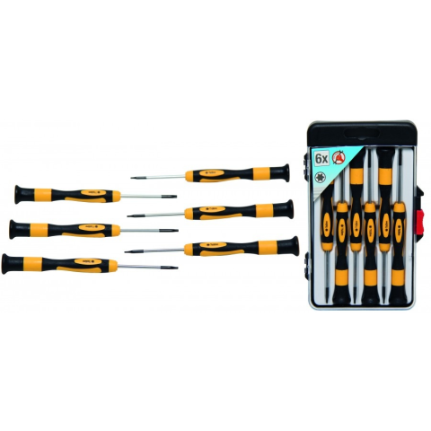Króm-vanádium acélból készül;Matt króm bevonat;Fekete színű csavarhúzó fejek;Két komponensű markolat;Nagy igénybevételnek ellenálló műanyag tok.A készlet tartalma:6 db Torx csavarhúzó: T6 x 50 mm; T7 x 50 mm, T8 x 50 mm, T9 x 50 mm, T10 x 50 mm, T15 x