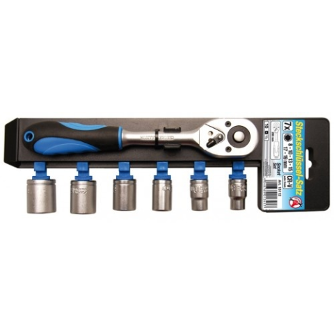 Króm-vanádium acélból készül.A készlet tartalma:Racsnis hajtószár, kétirányú, 3/8-osDugókulcs fejek: 8 - 10 - 13 - 15 - 17 - 19 mm