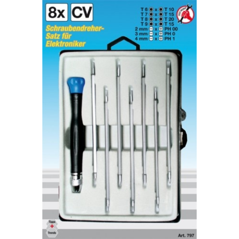 7 db cserélhető csavarhúzó szár Forgó kupakos markolat Műanyag tartóban Torx fejek: T6xT10 - T7xT15 - T8xT20 - T9xT15 Phillips/Lapos fejek: PH00x2mm - PH0x3mm - PH1x4mm