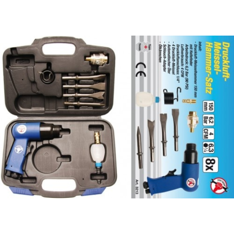 Légkalapács, 10 mm-es szerszámhajtással 4 részes vésőkészlet Levegős gyorcsatlakozó CE szabványnak megfelel Technikai adatok: - Ütésszám: 4500 ütés/perc - Légfelhasználás: 113 liter/perc