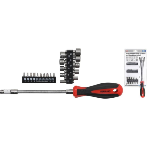 Króm-vanádium acélból készül 6.3 mm (1/4) hajtás Kétkomponensű, ergonomikus markolat Ideális a szűk, nehezen hozzáférhető helyeken való használatra A készlet tartalma: - 1 db flexibilis szárú csavarhúzó, hossz: 290 mm - 4 db bit, 25 mm-es hossz, lapos