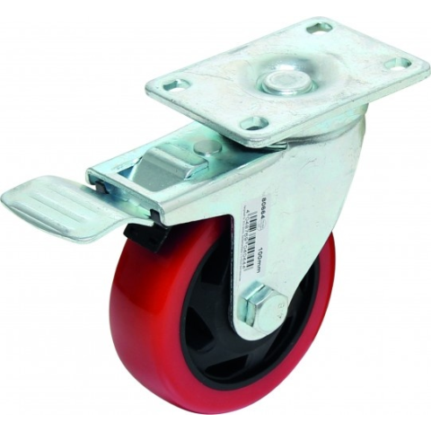 Piros-fekete poliuretán kerék;Fékes kivitel.További adatok:Max. teherbírás:100 kgKerekek átmérője:100 mmRögzítőfuratok távolsága:95x67 mmMagasság:126 mm