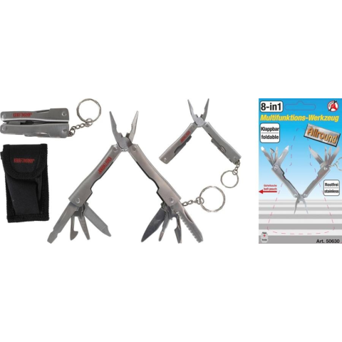 Rozsdamentes acélból készül Kompakt kivitel, zsebben is kényelmesen elfér Összehajtható kialakítás Praktikus övtokban Funkciók: - Kés - Kereszthornyú csavarhúzó - Sörnyitó - Minifűrész - Közepes méretű csavarhúzó - Körömreszelő / tisztító - Lapos fejű