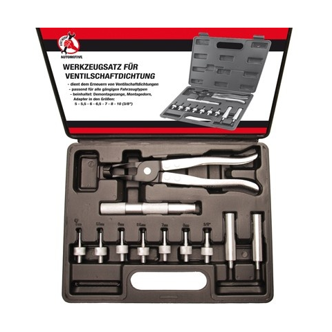 Lehetővé teszi a szelepszár szimeringek szakszerű cseréjét;A gépjárművek többségéhez használható.A készlet tartalma:Eltávolító szerszámBeszerelő szerszámAdapterek: 5 - 5.5 - 6 - 6.5 - 7 - 8 - 10 mm (3/8)