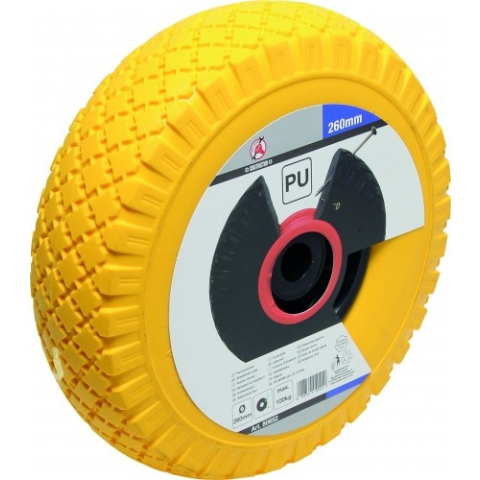 Poliuretánból készült, tömlő nélküli, tömör abroncs;Nem kell pumpálni, nem ereszt le, nem lesz defektes.További adatok:Max. terhelhetőség:100 kgKerék átmérő:260 mmTengely átmérő:20 mmTengely szélesség:75 mm