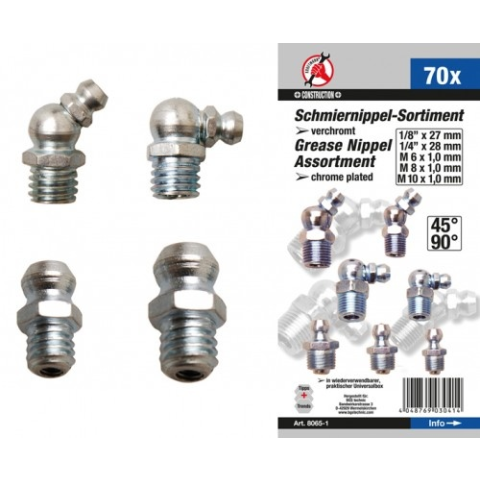 70 db-os készlet műanyag tároló dobozban. Zsírzószemek anyaga: A3 (szénacél) horganyzott kivitel Kivitel: Egyenes, 45 fokos, 90 fokos Méretek: - 1/8 - 1/4 - M6 x 1.0 - M8 x 1.0 - M10 x 1.0Élettartam anyag- és törésgarancia!