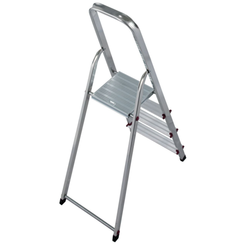 Kompakt alumínium állólétra különféle beltéri munkálatokhoz. Leírás: Körbefutó biztonsági korlátkeret Szegecselt csuklókapcsolatok Bordázott acél dobogó Stabil, szegecselt kapcsolat a szárak és a fokok között Csúszásmentes lábak a biztos állás érdeké