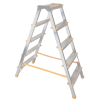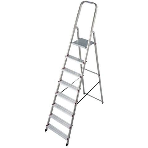 Kompakt alumínium állólétra különféle beltéri munkálatokhoz. Körbefutó biztonsági korlátkeret Szegecselt csuklókapcsolatok Bordázott acél dobogó Stabil, szegecselt kapcsolat a szárak és a fokok között Csúszásmentes lábak a biztos állás érdekében Stab