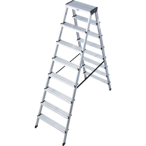 MONTO Dopplo két oldalon járható lépcsőfokos létra Könnyű, mindkét oldalon járható alumínium állólétra 3,30 m-es munkamagasságig ( 8 fokos változat). Robusztus, ütésálló acél csuklókapcsolatok 6 helyen szegecselt, robusztus kapcsolat a fokok és a s
