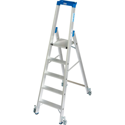 Krause Stabilo alumínium egy oldalon járható lépcsőfokos, gurítható, robusztus, professzionális felhasználásra készült állólétra. Nagyméretű, biztonságos állást garantáló, csúszásgátló dobogóval.