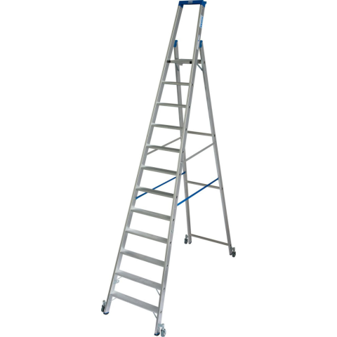 Krause Stabilo alumínium egy oldalon járható lépcsőfokos, gurítható, robusztus, professzionális felhasználásra készült állólétra. Nagyméretű, biztonságos állást garantáló, csúszásgátló dobogóval.