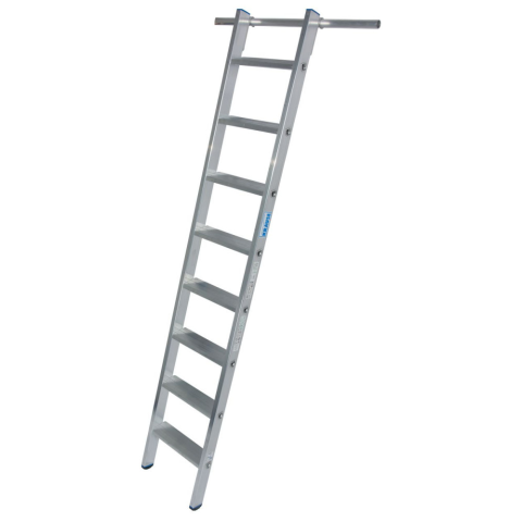 Lépcsőfokos alumínium polclétra, beakasztható Lépcsőfokos alumínium polclétra csőből készült (Ø 30 mm) sínszer- kezetekhez használható beakasztóhoroggal Használatkor a szárak felső végén található 2 kampóval akasztha- tó a csősínr