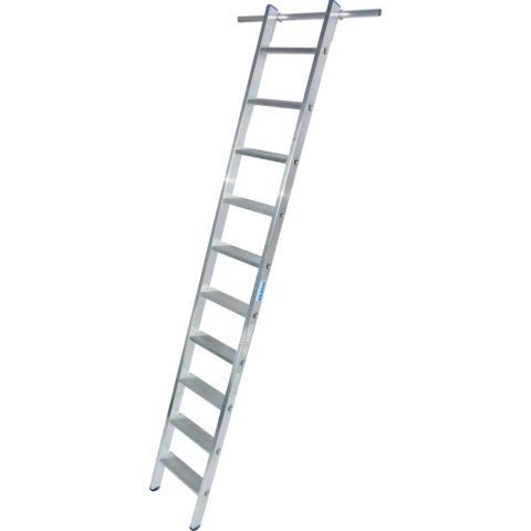 Lépcsőfokos alumínium polclétra, beakasztható Lépcsőfokos alumínium polclétra csőből készült (Ø 30 mm) sínszer- kezetekhez használható beakasztóhoroggal Használatkor a szárak felső végén található 2 kampóval akasztha- tó a csősínr