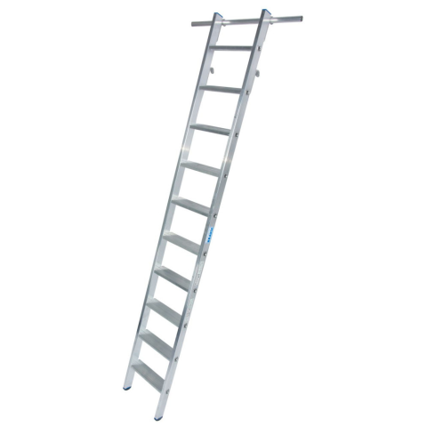 Lépcsőfokos alumínium polclétra, beakasztható Lépcsőfokos alumínium polclétra csőből készült (Ø 30 mm) sínszer- kezetekhez használható beakasztóhoroggal Használatkor a szárak felső végén található 2 kampóval akasztha- tó a csősínr