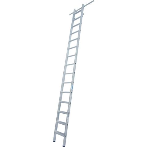 Lépcsőfokos alumínium polclétra, beakasztható Lépcsőfokos alumínium polclétra csőből készült (Ø 30 mm) sínszer- kezetekhez használható beakasztóhoroggal Használatkor a szárak felső végén található 2 kampóval akasztha- tó a csősínr