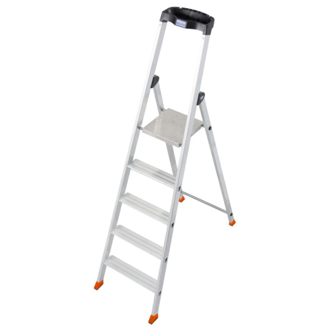 Robusztus és hosszú élettartamú alumínium állólétra nagy szilárdságú, peremezett fokokkal és különösen csúszásmentes dobogóval. Biztonsági kapaszkodókeret integrált vödörtartóval, szerszámtartóval és kábeltartókkal Csúcstechnológiás csuklók stabil acé