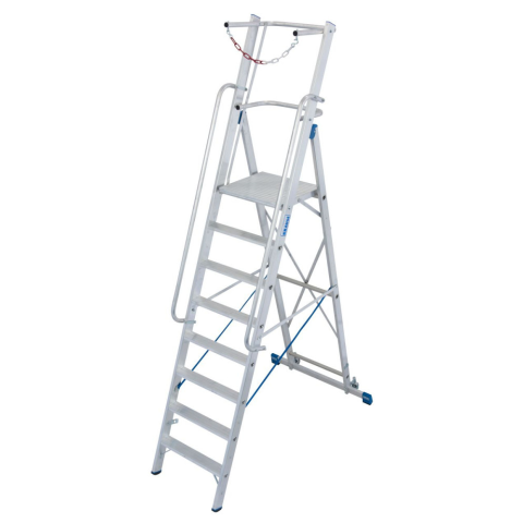 Lépcsőfokos állólétra nagy dobogóval és kapaszkodókerettel A gurítható lépcsőfokos állólétra nagyobb és kényelmesebb állófelülettel és körbefutó zuhanásvédelemmel. A háttámasz és a biztonsági lánc minden irányban biztonságos és nagy fe