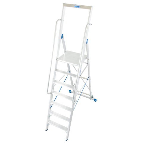 Gurítható lépcsőfokos állólétra nagy, kényelmes állófelülettel és biztonsági kapaszkodókerettel. Extra magas (1,0 m) kapaszkodókeret integrált tárolófelülettel hátkímélő munkavégzés érdekében Nagy, 500 x 450 mm-es állófelület A stabil kitámasztó az in