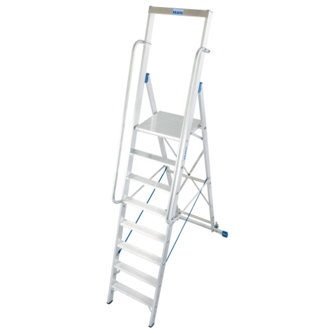 Lépcsőfokos állólétra nagy dobogóval Gurítható lépcsőfokos állólétra nagy, kényelmes állófelülettel és biztonsági kapaszkodókerettel. Extra magas (1,0 m) kapaszkodókeret integrált tárolófelülettel a hátkímélő munkavégzés érdekében