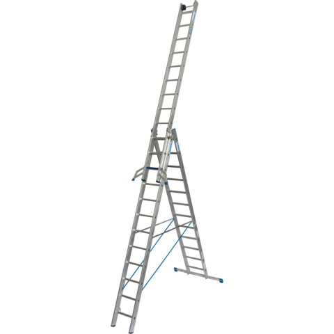 Sokcélú létra Háromrészes sokcélú alumínium létra létrafok/lépcsőfok kombinációval, TRBS 2121-2 szerinti alkalmazáshoz. Az új, innovatív létrafok/lépcsőfok kombinációnak köszönhetően a létrák feljutást segítő eszközként és munkaterületként is használhatóa