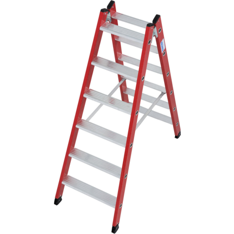 Két oldalon járható lépcsőfokos műanyag állólétra Két oldalon járható lépcsőfokos létra üvegszál erősítésű műanyagból Csúszásmentes, bordázott, 80 mm mély fokok Nagy szilárdságú kapcsolat a fokok és a szár között Nagy stabilitás a keskenyedő felépít