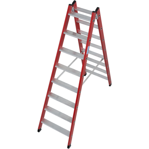 Két oldalon járható lépcsőfokos műanyag állólétra Két oldalon járható lépcsőfokos létra üvegszál erősítésű műanyagból Csúszásmentes, bordázott, 80 mm mély fokok Nagy szilárdságú kapcsolat a fokok és a szár között Nagy stabilitás a keskenyedő felépít