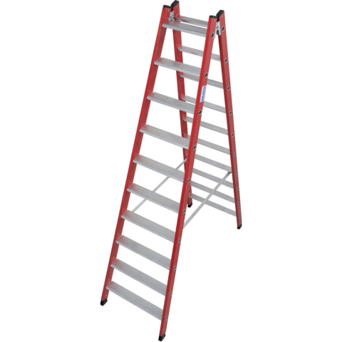 Két oldalon járható lépcsőfokos műanyag állólétra Két oldalon járható lépcsőfokos létra üvegszál erősítésű műanyagból Csúszásmentes, bordázott, 80 mm mély fokok Nagy szilárdságú kapcsolat a fokok és a szár között Nagy stabilitás a keskenyedő felépít