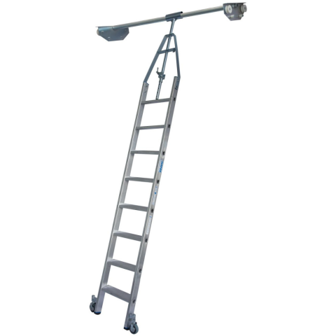 Lépcsőfokos elfordítható polclétra, cső vezetősínnel Lépcsőfokos alumínium polclétra az átfordítható sínrendszerhez használható integrált futószerkezettel. A szárak és a fokok közötti nagy szilárdságú peremezett kapcsolat és a 80