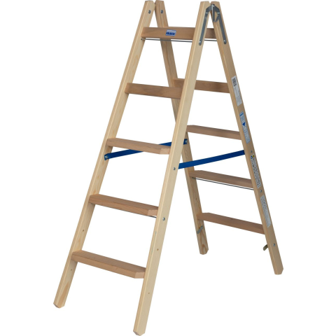 - Kényelmes, két oldalon járható fa állólétra a TRBS 2121-2 szabványnak megfelelő lépcső-/létrafok kombinációval.