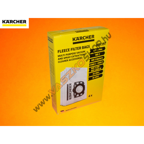 Kärcher WD3 papírporzsák , új filz porzsák Gyári cikkszám: 6.959-130.0 , 2.863-314.0 , 2.863-314.0 Méretek: Hossza: 80 mm Szélessége: 212 mm Magassága: 310 mm A készlet tartalma: 4 db porzsák 2-rétegű papír porzsák kiváló szűrőteljesítménnyel. A papí