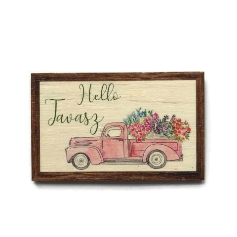 Fa tabla - Hello tavasz teherautóval Méret: 5x8cm Fa tabla - Hello tavasz teherautóval Méret: kb 5x8cm Díszítésekhez használható fa figura. A figura jól mutat virágboxokban, függő díszeken.