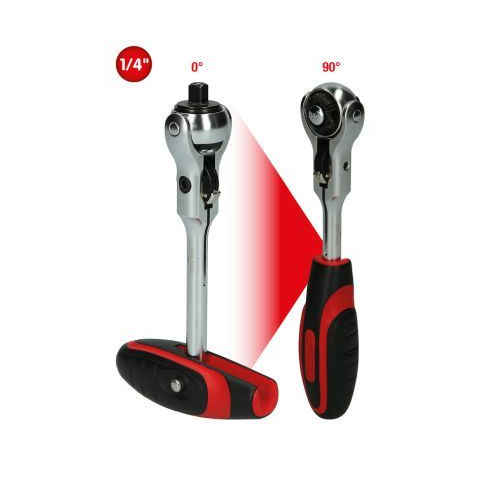 Fogazás: 72xHossz: 165mmMeghajtás: 1/4 négyszögSzabvány: DIN 3120, ISO 1174Racsnis hajtókar, 1/4, irányváltós, döntheto, 165 mm, z=72, MODIFIX, KS-TOOLS Kézi működtetésű dugókulcs betétekhez, golyós rögzítéssel, finoman fogazott racsniszerkezettel. A forg