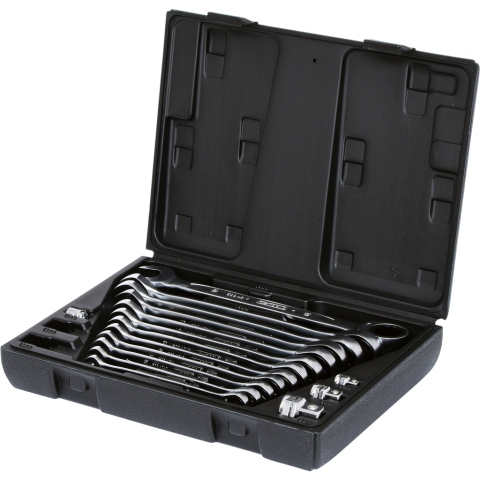 Kihajtás típusa: külső hatszögKihajtás: 8–19 mmSzabvány: DIN 3110, ISO 3318Csillag-villáskulcs racsnis készlet, 8–19 mm, 16 részes Csillagkulcs, fejbe pattintható adapterekkel, műanyag kofferben. króm-vanádium acél, fényes krómozottGEARplus racsnis csilla