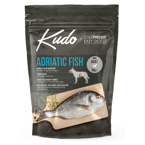 A Kudo Adriatic Fish Mini Adult egy kifejezetten kistestű kutyák számára készült, hidegen sajtolt eledel. Tengeri halakból, zöldségekből, gyümölcsökből és gyógynövényekből áll, alacsony gabonatartalom mellett a könnyű emészthetőség érdekében. Minden tápanyagot tartalmaz, amely egy 1 éves és annál idősebb kutya számára szükséges. Gazdag halolajban, mely a benne lévő omega-3 és omega-6 zsírsavaknak köszönhezően egészségessé varázsolja a kutyád