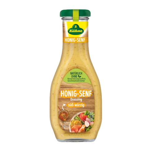 Kühne mézes mustáros öntet 250 ml A fűszeres, szemcsés mustár friss virágmézzel olvad össze, ízletes szimbiózist alkotva. Összetevők: víz, glükóz-fruktóz szirup, repceolaj, mustár 7% (víz, MUSTÁRMAG, borecet, só, fűszerek), fehérborecet, méz (3%