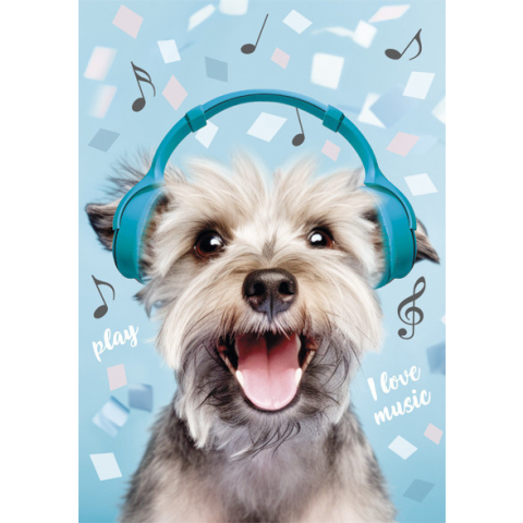 Jegyzetfüzet borító – kutyus fejhallgatóval, "I love music" dizájn PKK763488BEz az aranyos és vidám borítójú jegyzetfüzet tökéletes választás minden zenekedvelő állatbarátnak. A mosolygó, fejhallgatót viselő kutyus élénk hátteret kapott zenei jegyekkel és színes geometriai elemekkel, amit a „play” és „I love music” feliratok tesznek még hangulatosabbá.Jellemzők:Motiváló, vidám dizájn: kutya fejhallgatóval, zenei motívumokkalKék alapszín, fehér és