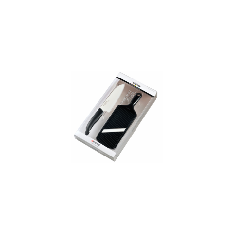 A Kyocera kerámia kés készlet 2 darab terméket tartalmaz, 1 darab Santoku kerámia kést és 1 darab 4 méretben állítható szeletelőt. Pengéjük cirkónium- oxid / kerámia/ anyagból előállított, ez által 50%- al keményebb, mint az acél. A kés és szeletelő élezését kézzel végzik, ennek eredménye, hogy rendkívül éles és ellenálló, élét 10 x hosszabb ideig tartja meg, mint más professzionális kések, szeletelők. A készletet tartalmazó termékek