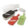 A Kyocera kerámia szeletelő szett tartalmaz 1 darab állítható szeletelőt, 1 darab "Julienne" szeletelőt, 1 darab műanyag reszelőt és 1 darab kézvédőt, mindez egy formatervezett dobozban tárolható, ami szeleteléskor gyűjtő dobozként is használható, így a szeletelt zöldség, gyümölcs, sajt nem szóródik szét. A Kyocera szeletelők pengéje cirkónium- oxid /kerámia/ anyagból készült. Rendkívül éles és ellenálló, valamint 10 x tovább megtartja az élét, m