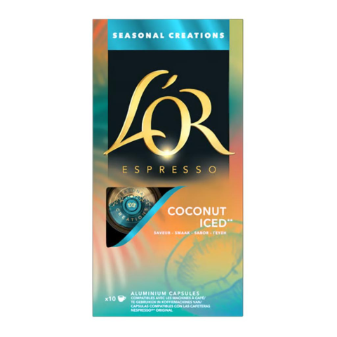 Kávékapszula L`OR Coconut iced Nespresso kompatibilis 10 kapszula/doboz Nespresso kompatibilis L'or kaszula, Hűsítő, kókuszos jegeskávé-élmény, egzotikus ízvilággal, nyári frissességhez. Intenzitás: 6. Kiszerelés: 10 db kapszula/ doboz