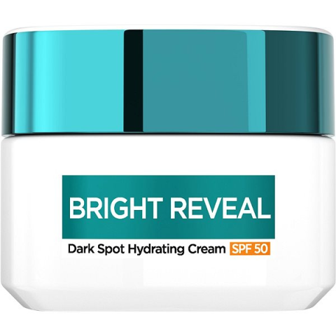 Arckrém - zsíros, normál, kombinált, száraz és érett bőrre ajánlott, 50 SPF védőfaktor, L’ORÉAL PARIS Bright Reveal hidratáló krém sötét foltok ellen magas védelmet nyújt UVB és UVA sugárzás ellen, és közben megelőzi az öregedés jeleit és a napfény okozta sötét foltok kialakulását. Hasz