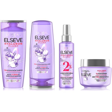 Hajápoló szett - minden hajtípusra, hialuronsavval, a táplálkozáshoz, teltség és ragyogás, sampont tartalmaz, Kondicionáló, szérum és maszk L'ORÉAL PARIS Elseve Hyaluron Plump hajápoló szettKészlet – sampon, kondicionáló, szérum és hajpakolás, 800 ml A kiszáradás a gyenge haj első jele. Előzd meg a további károsodást és a száraz hajat a L