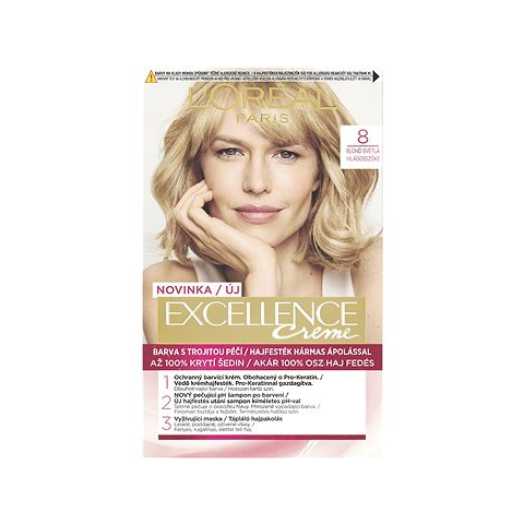 Hajfesték - szőke árnyalat, tartós típus, folyékony állag, lenövés/ősz hajszál elfedő hatás, minden hajtípusra, 6 hét becsült max. tartósság, kesztyű, applikátor és használati útmutató a csomagban Permanentní barva na vlasy L'ORÉAL EXCELLENCE Creme 8 blond světlá perfektně oživí vaši stávající blond barvu.A hosszan tartó L'ORÉAL EXCELLENCE Creme hajfesték világos szőke s