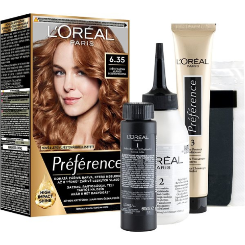 Hajfesték - barna árnyalat, tartós típus, folyékony állag, lenövés/ősz hajszál elfedő hatás, minden hajtípusra, 8 hét becsült max. tartósság, kesztyű, hajápoló és használati útmutató a csomagban L'ORÉAL PARIS Préférence - Élénk hajszín, amely sokáig tartÉrj el fényűző hajszínt ezzel a legendás, hosszan tartó L'ORÉAL PARIS Préférence hajfestékkel, amely rendkívüli színező összetevőkkel büszkél