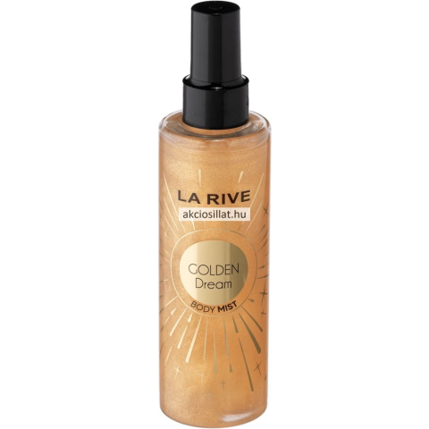 La Rive Golden Dream csillámos testpermet 200ml Fej: gardénia, jázmin, narancsvirág, Szív: málnával, nerolival, Alap: borostyán, pacsuli, fehér méz. La Rive vegán testpermet