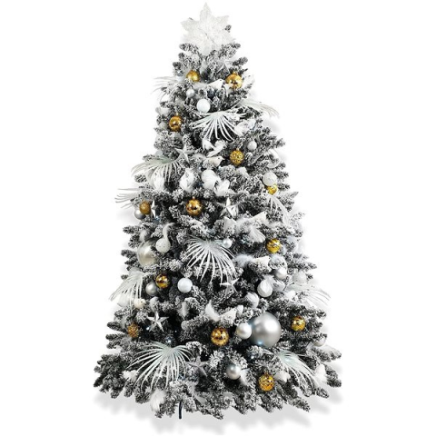 Műfenyő - mű, jedle 2D tűlevéllel, zöld kivitel, magassága 210 cm, szélessége 127 cm, beltéri, a felszereltség része állvány, díszek és havas borítás, arany díszek Az elegáns LAALU feldíszített karácsonyfa - Polárarany, 133 dísz, 210 cm termék leglényegesebb tulajdonságai Az elegáns LAALU műfenyő kifejezetten beltéri használatra lett tervezve Alakja és tűlevelei