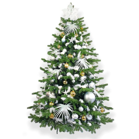 Műfenyő - mű, jedle 3D tűlevéllel, zöld kivitel, magassága 240 cm, szélessége 144 cm, beltéri, a felszereltség része állvány, díszek, fehér, ezüst és arany díszek A dekoratív LAALU feldíszített karácsonyfa - Polárarany II, 163 dísz, 240 cm termék alapvető paraméterei A dizájnos LAALU műfenyő beltéri környezetben való használatra készült Emlékeztet az igazi jege